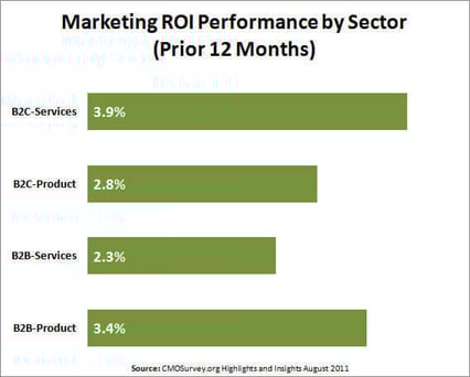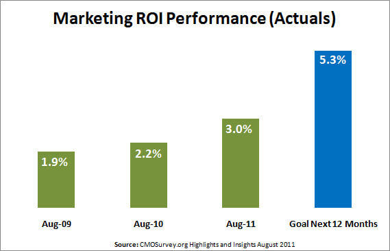 CMOSurvey.org just published its August 2011 survey results of top marketers used to predict the future of markets, track marketing excellence, and prove the value of marketing in society. There were some interesting nuggets in the survey pertaining to Return on Marketing Investment, or simply, Marketing ROI. I've extracted the information from slides 26 and 27 and created a couple of graphs included below.