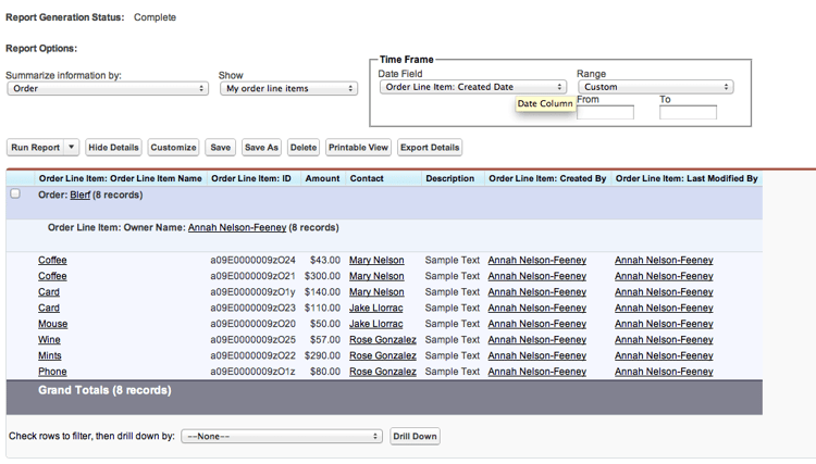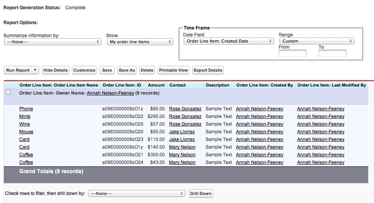 I created a summary report with the Order and Order Line Item Owner as the groupings on the report.