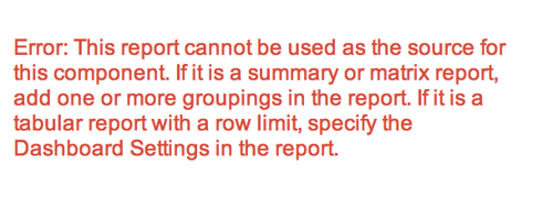 If you have any Dashboards that happen to work off of this Report, they will not function as Dashboards cannot use Summary Reports that do not have any groupings. So if this was your only grouping on the report, you would see the following error on your dashboard.