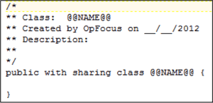 Changing the default templates couldn’t be easier – just start typing! For example, here at OpFocus, we always start our Classes with a standard comment block, so we’ve changed our ApexClass-Default.template file to look like this: