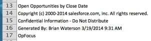 While this information may be useful for some, until now there was no way to turn this off. With Spring ’14 you can disable report footers by going to Settings | Customize | Reports & Dashboards | User Interface and checking the “Export Reports Without Footers” box.
