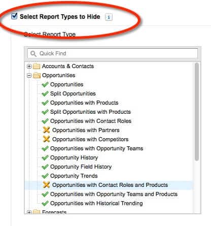 When selecting the available report types, the green checkbox indicates they are available and the orange x indicates they are hidden. If all report types in a folder are hidden then the folder will also disappear. This is an easy, fast option to clean up the report type clutter, though one limitation is that it is all or nothing. At this time report types cannot be restricted by role or profile.