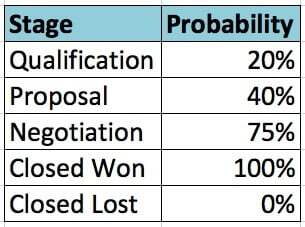 Let’s look at an example of how this can be used. Imagine your open opportunities had the following stages and probabilities: