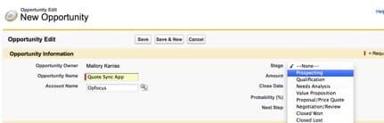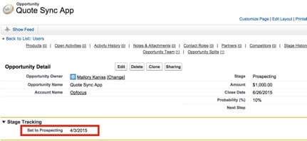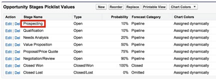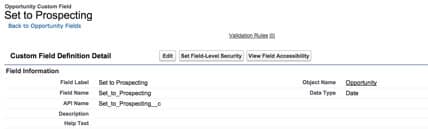 First, create a Date field for each of the Opportunity stages; in this particular system, the first stage is “Prospecting.”