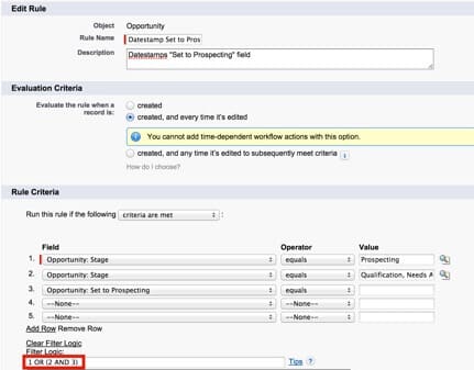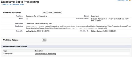 It is also important to note that this workflow will also be able to account for stage skipping. For example, if the test Opportunity was set to “Qualification” instead of “Prospecting,” “Set to Prospecting” will still be date-stamped with the same date that “Qualification” was set.