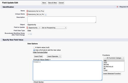 Next, create an immediate Field Update action for the Workflow Rule. The field to update should be set to your date-stamp field (“Set to Prospecting”), and the new value that will be populating this field will be “TODAY()”.