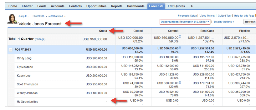 Having a choice of whether or not include an individual's, such as a Sales Manager's, personal quota in the in the totals and subtotals for the 'My Team' view would be a nice add-on feature. Currently it only shows shows my quota in subtotals and totals in my manager's view. In the screen shot below, Valerie's personal quota isn't shown in this view of Valerie and her subordinates, even though her Forecasted deals are. To see Valerie's quota, we would have to view the Forecasts tab as the person above Valerie in the Forecast Hierarchy.