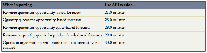 Also, if you do have multiple Forecast types, you'll need the Forecast Type ID. This also requires data loader API Version 30.0. Look at the chart below to see what version of the data loader API is required for various quota import types.
