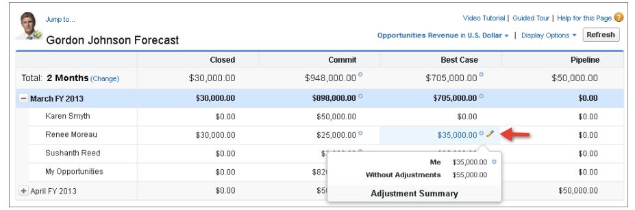Allow Forecast managers to add adjustments to make Forecasts reflect what the manager perceives as the likely final outcome during a Forecast period by sales rep (when a rep or team is too optimistic or conservative Opportunity amounts).