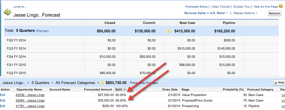 Opportunity Team Forecasts and quotas - whoo hoo! Show the split percentage in the Opportunity list below the Forecast! Please note that as of Spring '14 splits must equal 100%. However, there is a PILOT for Spring '14 Opportunity Split Overlays where splits can total greater than 100%; indirectly responsible team members need to get credit as well to allocate credit in a more flexible manner (look for general availability over the next release or two).